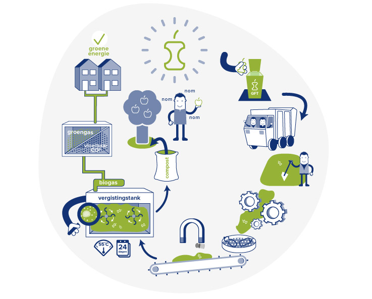 Ongeveer twee derde van het GFT-afval wordt meteen tot compost verwerkt, iets meer dan een derde wordt eerst vergist: dat levert behalve compost ook biogas (groen gas) op.