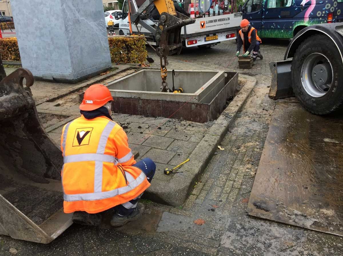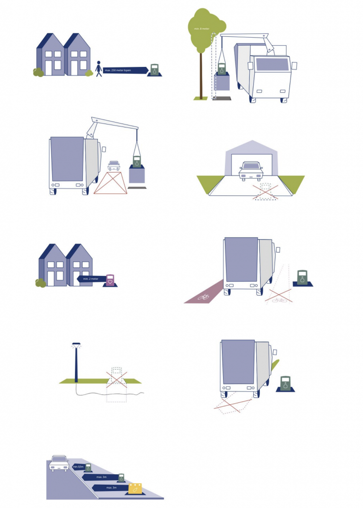 De locatiebeheerder heeft een overzicht van ondergrondse kabels en leidingen. Daar werken we omheen: de container mag voor de veiligheid niet te dicht bij kabels en leidingen worden geplaatst. Op de locaties zelf worden “proefsleuven” gegraven, om te kijken of het klopt dat er daar geen kabels en leidingen onder de grond liggen. Verder wordt er bodemonderzoek gedaan zodat we het op tijd weten als de grond verontreinigd is. Er wordt ook goed op gelet dat de loopafstand naar de wijkcontainer beperkt blijft en dat de vuilniswagen er goed bij kan.